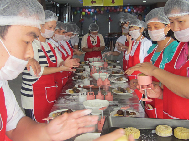 走進世博大廈服務(wù)中心,鮮花隨處可見,華美的裝修設(shè)計使人心曠神怡,現(xiàn)場充滿了濃郁的節(jié)日氛圍。大家熱情高漲、十分投入,和面、搟皮,包餡,然后刷上蛋液,撒上芝麻,最后烘烤出爐。員工們邊動手制作月餅邊盡情享用自己的“完美作品”,并拍照留念,記錄下了許多歡樂的瞬間。而現(xiàn)場專業(yè)的月餅師傅則耐心地傳授制作月餅的要領(lǐng),聽得大伙頻頻點頭。另外,除了可以親手制作月餅,還可現(xiàn)場烘焙,讓員工們可現(xiàn)場品嘗至自己制作的月餅,活動現(xiàn)場處處洋溢著溫馨和美的氣氛……