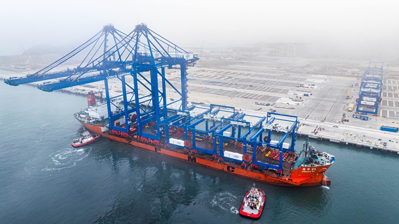 長(zhǎng)長(zhǎng)的防波堤宛若臂膀守護(hù)著嶄新的港口,高高的吊橋?qū)⒆陨虾q倎?lái)的“秘魯輪”上裝有中國(guó)“新三樣”的集裝箱卸下,又將滿(mǎn)載秘魯特色產(chǎn)品的集裝箱裝上即將駛往中國(guó)的“新上海輪”。